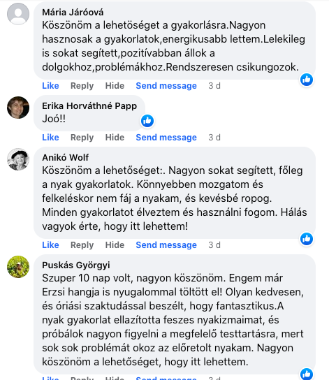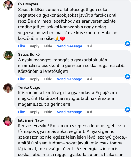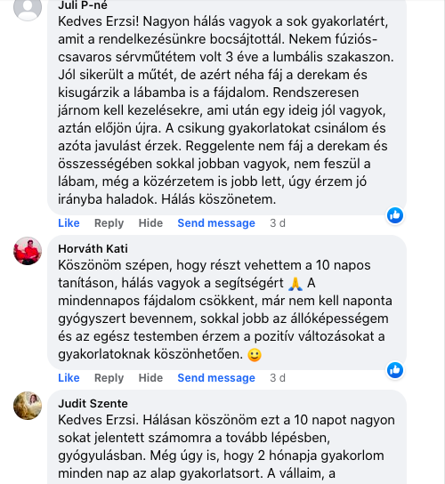Ahogy elkezdtük ezeket a csikung gyakorlatokat a gerincre , erőteljesen csökkentek a fájdalmak napról napra, annyira, hogy a 4. vagy 5. napon már hanyatt is tudtam feküdni, és végigaludtam az éjszakát. Csinálom továbbra is ezeket a gyakorlatokat, és tudom, hogy teljesen helyrejövök! Végtelenül hálás vagyok, amiért élhettem ezzel a lehetőséggel!”